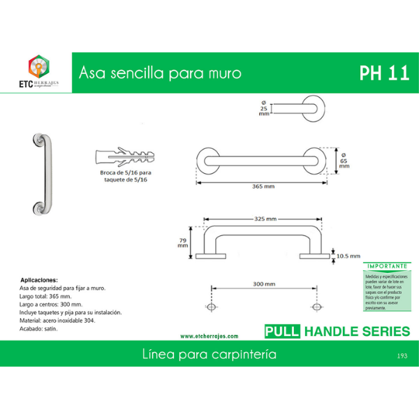 Asa Sencilla para Muro Acero Inox PH-11 36.5 cm ETC