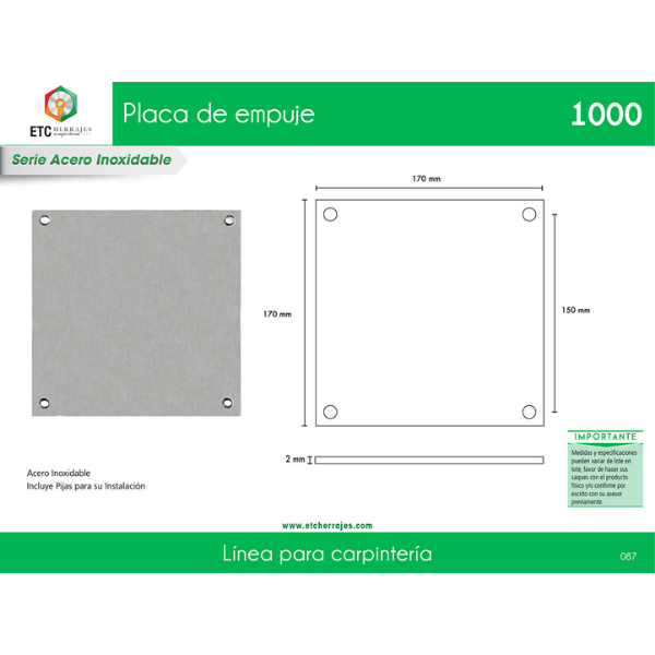 Placa de Empuje Acero Inox Mod. 1000 17 cm ETC (pza)