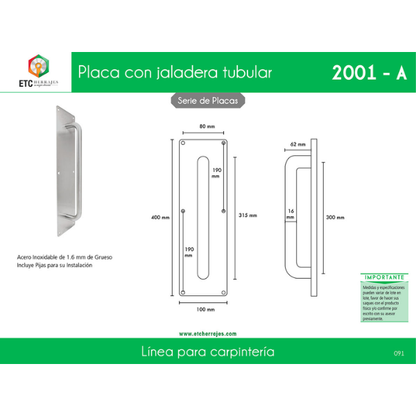 Manija con placa fabricada en acero inoxidable con calibre de 1.6mm de grueso. Incluye pijas para su instalacion.